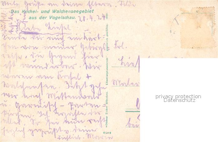 73317765 alte Postkarte Kochel See Kochelsee Walchensee Alpenpanorama aus der Vogelperspektive postalisch gelaufen Reliefkarte Erhaltung siehe scans [FriedD77] KatCode: 11110009173133