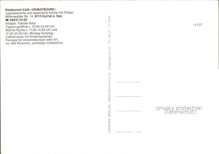 72105439 Kochel See Restaurant Cafe Heimatbuehne postalisch nicht gelaufen Erhaltung siehe scans KatCode: 11110009173133