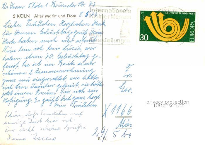 72917691 alte Postkarte Koeln Rhein Alter Markt und Dom postalisch gelaufen Erhaltung siehe scans [FriedD77] KatCode: 11110005315000