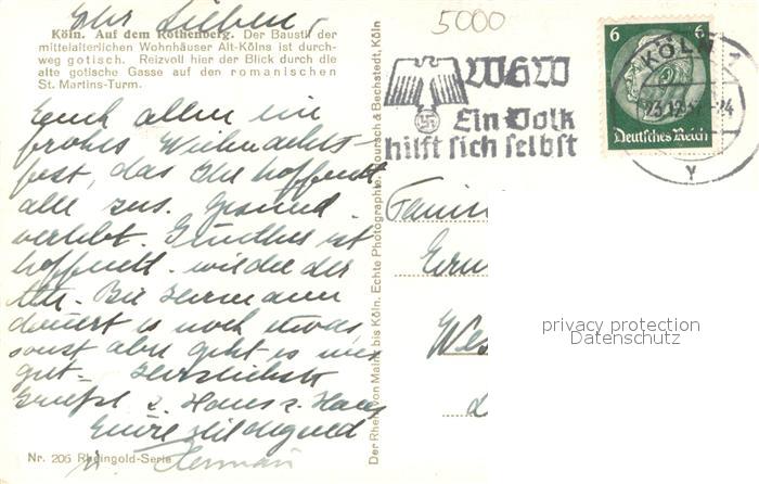 73694101 alte Postkarte Koeln Rhein Auf dem Rothenberg postalisch gelaufen Erhaltung siehe scans [WerneD78] KatCode: 11110005315000