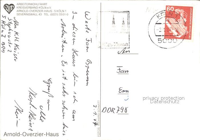 72419542 alte Postkarte Koeln Rhein AWO Arnold Overzier Haus postalisch gelaufen Erhaltung siehe scans KatCode: 11110005315000