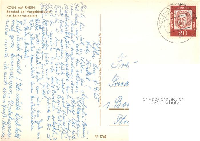 43495980 alte Postkarte Koeln Rhein Bahnhof der Vorgebirgsbahn am Barbarossaplatz postalisch gelaufen Erhaltung siehe scans [WerneD78] KatCode: 11110005315000
