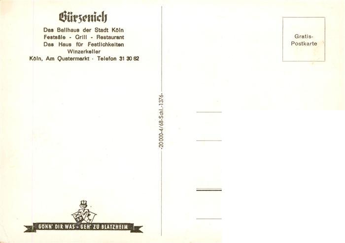 73894232 Koeln Rhein Ballhaus Guerzenich Restaurant Winzerkeller postalisch nicht gelaufen Erhaltung siehe scans [FriedD77] KatCode: 11110005315000