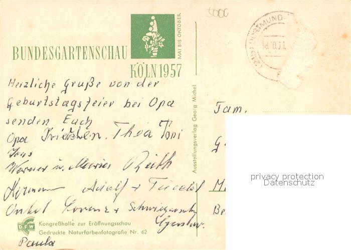 73690846 alte Postkarte Koeln Rhein BUGA 1957 Kongresshalle postalisch gelaufen Erhaltung siehe scans [WerneD78] KatCode: 11110005315000