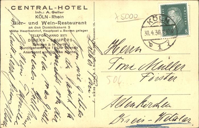 41300495 KoeLN Rhein Central Hotel A. Geller Bier- und Weinrestaurant postalisch gelaufen Alte Ansichtskarte Postkarte alte Postkarte hz_L Katcode 11110005315000