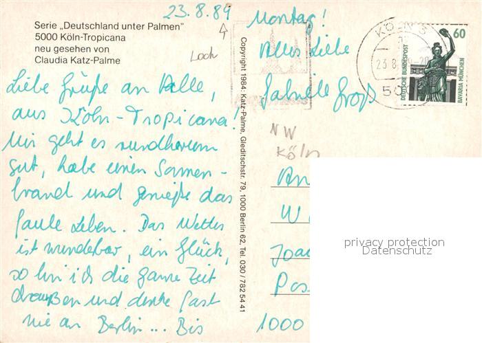 73020207 alte Postkarte Koeln Rhein Deutschland unter Palmen Claudia Katz-Palme postalisch gelaufen Erhaltung siehe scans [NatalD47] KatCode: 11110005315000