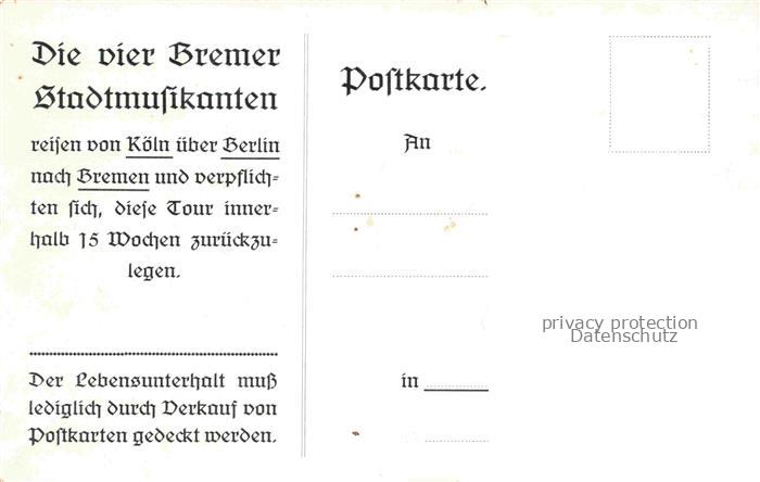 34146368 KoeLN RHEIN Die vier Bremer Stadtmusikanten Tour von Koeln ueber Berlin nach Bremen postalisch nicht gelaufen Erhaltung siehe scans [WerneD78] KatCode: 11110005315000