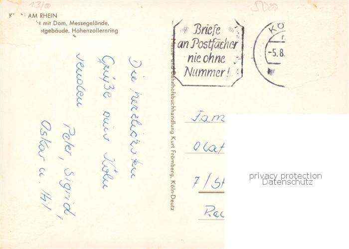 73868487 alte Postkarte Koeln Rhein Dom Messegelaende Postgebaeude Hohenzollernring postalisch gelaufen Erhaltung siehe scans [WerneD78] KatCode: 11110005315000