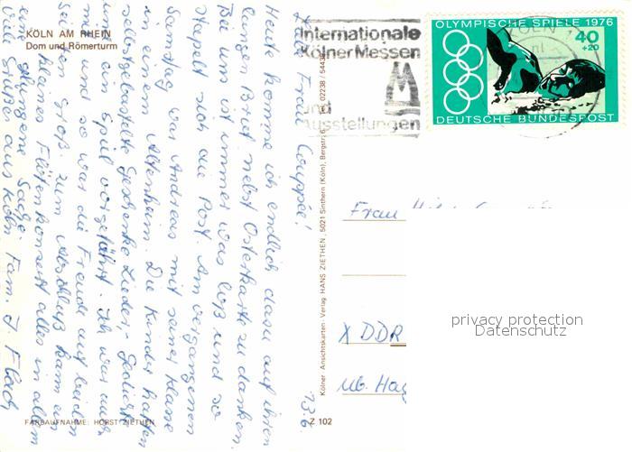 72665995 alte Postkarte Koeln Rhein Dom und Roemerturm postalisch gelaufen Erhaltung siehe scans [WerneD78] KatCode: 11110005315000