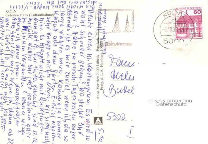 72667343 alte Postkarte Koeln Rhein Fliegeraufnahme Colonia Haus postalisch gelaufen Erhaltung siehe scans [AndreD76] KatCode: 11110005315000