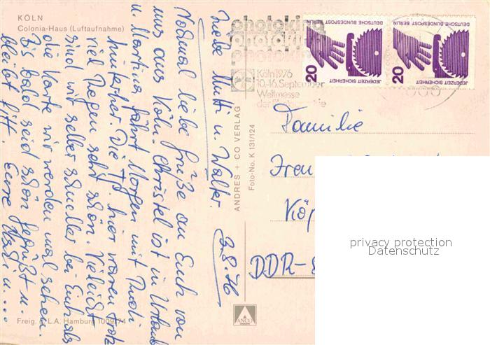 72917201 alte Postkarte Koeln Rhein Fliegeraufnahme Colonia Haus postalisch gelaufen Erhaltung siehe scans [KathaD81] KatCode: 11110005315000
