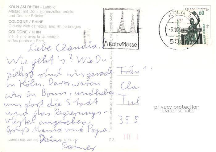 73118056 alte Postkarte Koeln Rhein Fliegeraufnahme Dom Hohenzollernbruecke Deutzer Bruecke postalisch gelaufen Erhaltung siehe scans [NatalD47] KatCode: 11110005315000