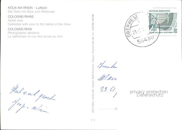 72241856 alte Postkarte Koeln Rhein Fliegeraufnahme Dom Rheinufer postalisch gelaufen Erhaltung siehe scans KatCode: 11110005315000