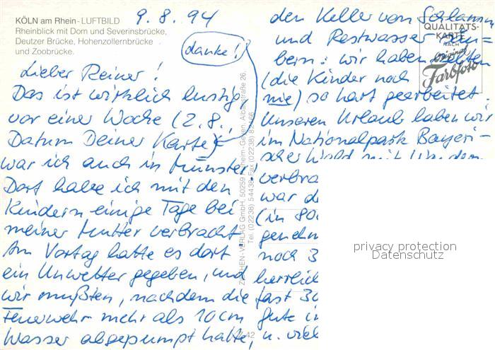 72890279 Koeln Rhein Fliegeraufnahme Dom Severins- Deutzer- Hohenzoller- Zoobruecke postalisch nicht gelaufen Erhaltung siehe scans [AndreD76] KatCode: 11110005315000