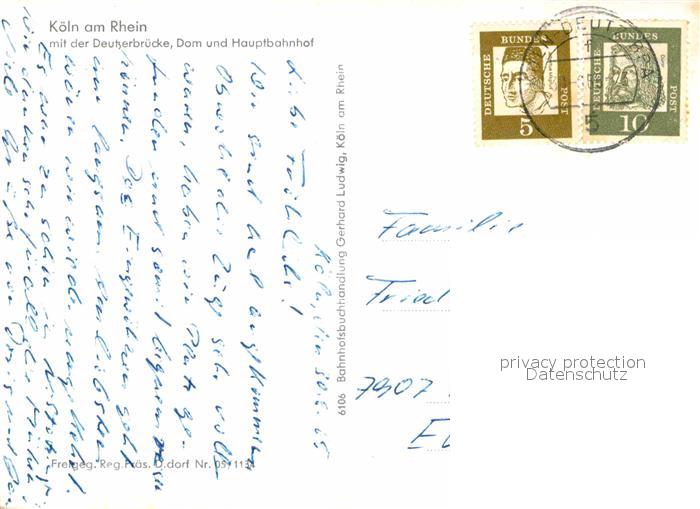 72831463 alte Postkarte Koeln Rhein Fliegeraufnahme mit Deutzerbruecke Dom und Hauptbahnhof postalisch gelaufen Erhaltung siehe scans [LiesaD40] KatCode: 11110005315000