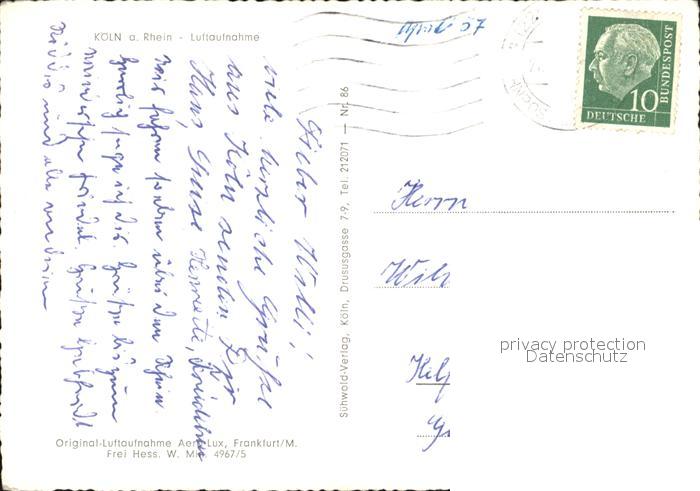72409447 alte Postkarte Koeln Rhein Fliegeraufnahme mit Dom postalisch gelaufen Erhaltung siehe scans KatCode: 11110005315000