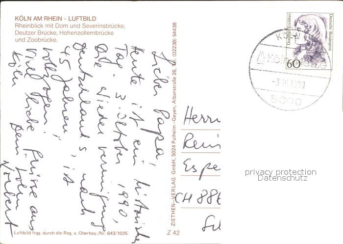 71952411 alte Postkarte Koeln Rhein Fliegeraufnahme Rheinblick Dom Severinsbruecke postalisch gelaufen Erhaltung siehe scans KatCode: 11110005315000
