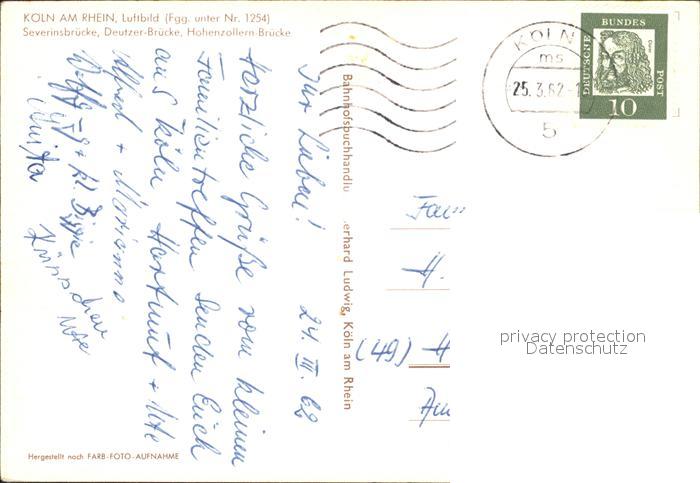 71929384 alte Postkarte Koeln Rhein Fliegeraufnahme Severinsbruecke Deutzerbruecke Hohenzollernbruecke postalisch gelaufen Erhaltung siehe scans KatCode: 11110005315000