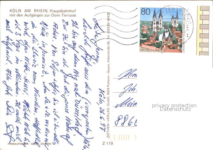 71913308 alte Postkarte Koeln Rhein Hauptbahnhof mit Dom Terrasse postalisch gelaufen Erhaltung siehe scans KatCode: 11110005315000