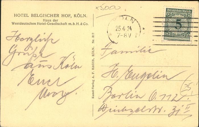 41399229 Koeln Rhein Hotel Belgischer Hof Bierstall Dom postalisch gelaufen gute Erhaltung Alte Ansichtskarte Postkarte alte Postkarte hz_F Katcode 11110005315000