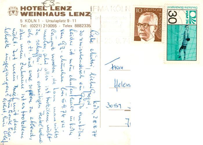 73875815 alte Postkarte Koeln Rhein Hotel Lenz Weinhaus Lenz Gastraeume postalisch gelaufen Erhaltung siehe scans [FriedD77] KatCode: 11110005315000
