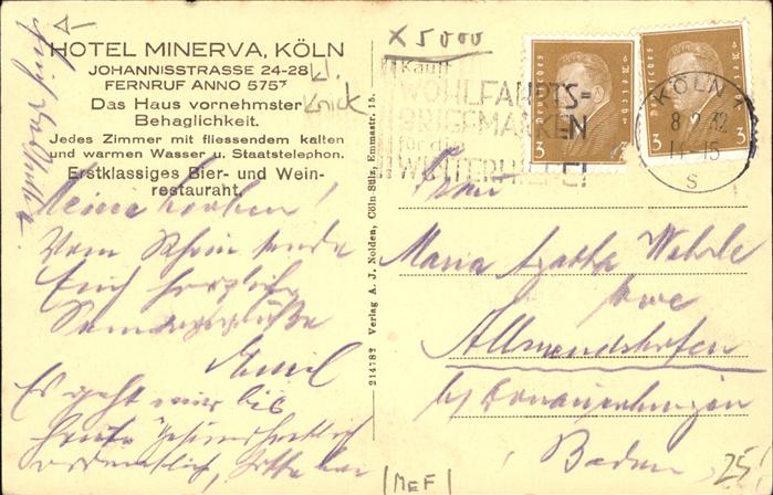 41399201 Koeln Rhein Hotel Minerva postalisch gelaufen Erhaltung mit Maengel Alte Ansichtskarte Postkarte alte Postkarte hz_F Katcode 11110005315000