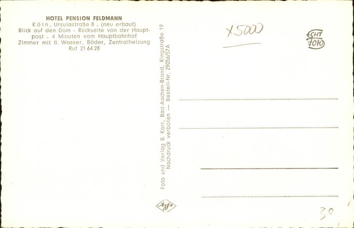 41399279 Koeln Rhein Hotel Pension Feldmann Dom postalisch nicht gelaufen gute Erhaltung Alte Ansichtskarte Postkarte hz_F Katcode 11110005315000