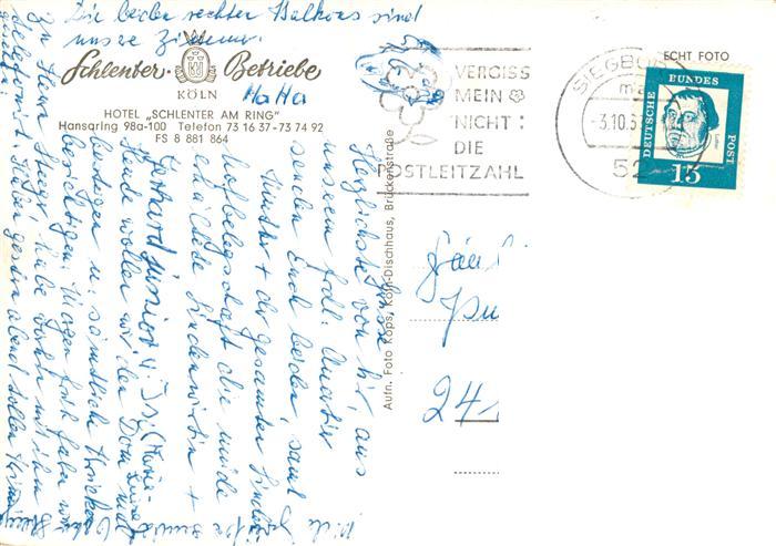 73877928 alte Postkarte Koeln Rhein Hotel Schlenter am Ring Nachtaufnahme postalisch gelaufen Erhaltung siehe scans [FriedD77] KatCode: 11110005315000