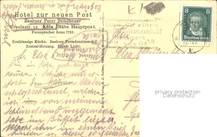 31841228 alte Postkarte Koeln Rhein Hotel zur neuen Post Ursulastrasse postalisch gelaufen Erhaltung siehe scans KatCode: 11110005315000