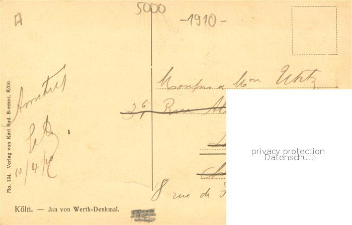 73694286 alte Postkarte Koeln Rhein Jan von Werth Denkmal postalisch gelaufen Erhaltung siehe scans [WerneD78] KatCode: 11110005315000