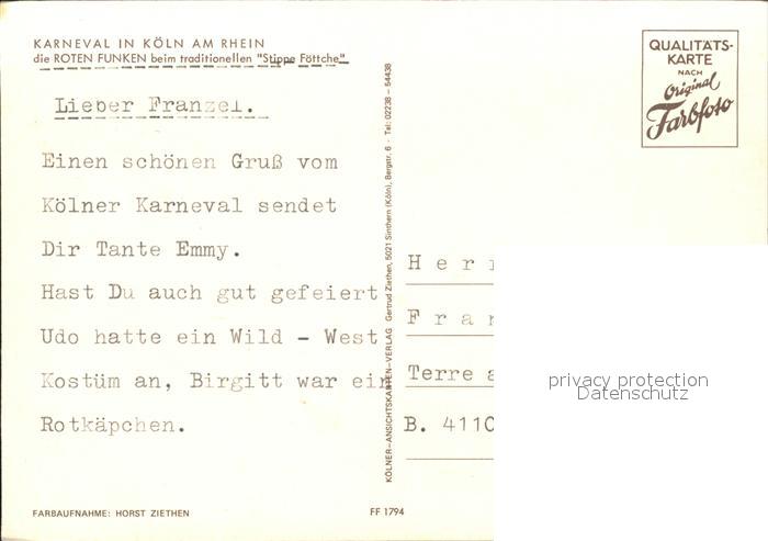71935043 Koeln Rhein Karneval Die Roten Funken beim Stippe Foettche postalisch nicht gelaufen Erhaltung siehe scans KatCode: 11110005315000