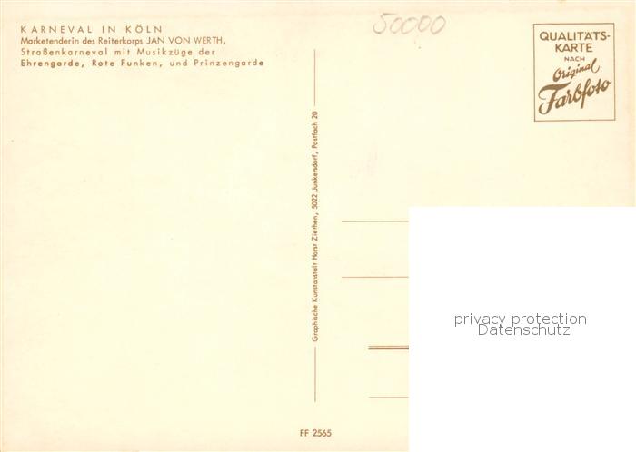 73865200 Koeln Rhein Karneval Marketenderin des Reiterkorps Jan von Werth Strassenkarneval Ehrengarde Rote Funken Prinzengarde postalisch nicht gelaufen Erhaltung siehe scans [WerneD78] KatCode: 11110005315000