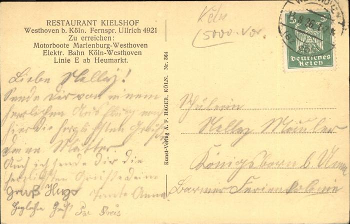 41394413 Koeln Rhein Kielshof Restaurant postalisch gelaufen gute Erhaltung Alte Ansichtskarte Postkarte alte Postkarte hz_L Katcode 11110005315000