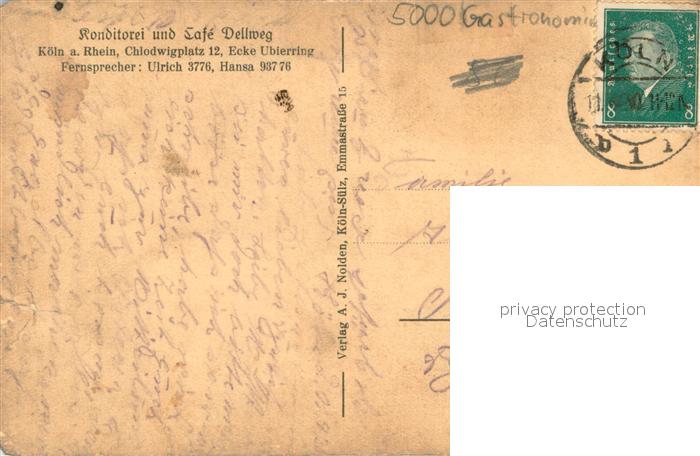 73703176 alte Postkarte Koeln Rhein Konditorei und Vafe Dellweg Innenansicht postalisch gelaufen Erhaltung siehe scans [LiesaD40] KatCode: 11110005315000