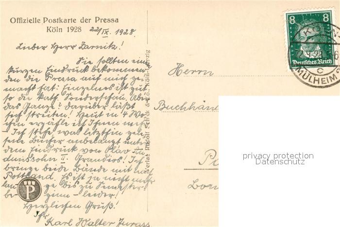 73372856 alte Postkarte Koeln Rhein Messehof Offizielle Postkarte der Pressa postalisch gelaufen Erhaltung siehe scans [FriedD77] KatCode: 11110005315000
