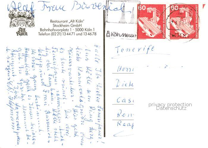 73864088 alte Postkarte Koeln Rhein Restaurant Alt Koeln Stockheim GmbH Gaststube postalisch gelaufen Erhaltung siehe scans [WerneD78] KatCode: 11110005315000