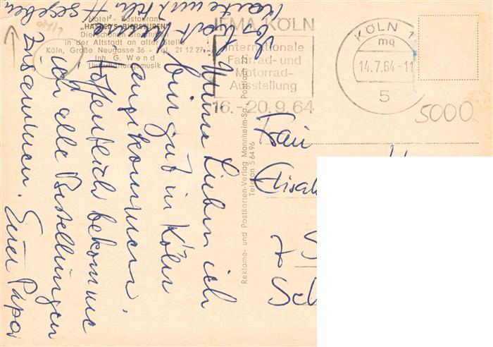 73891643 alte Postkarte Koeln Rhein Restaurant Hassels Bierstuben Bar postalisch gelaufen Erhaltung siehe scans [FriedD77] KatCode: 11110005315000