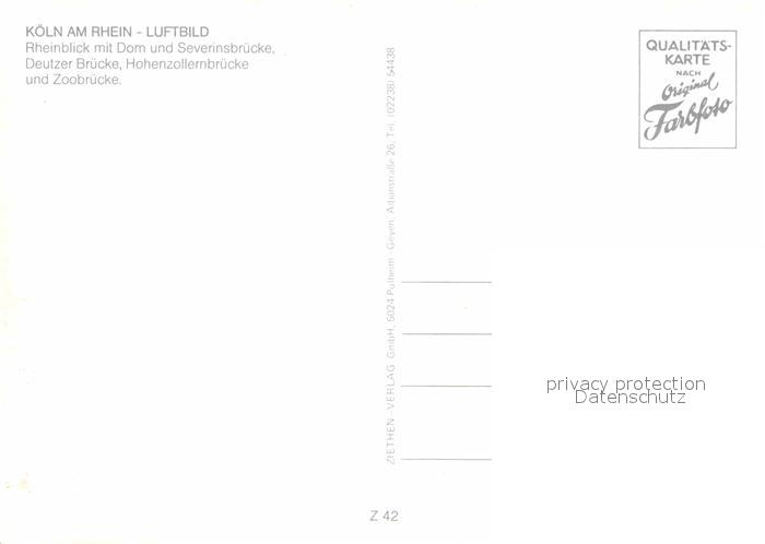 72839435 Koeln Rhein Rheinblick mit Dom Severinsbruecke Deutzer Bruecke Hohenzollernbruecke Zoobruecke Fliegeraufnahme postalisch nicht gelaufen Erhaltung siehe scans [FriedD77] KatCode: 11110005315000