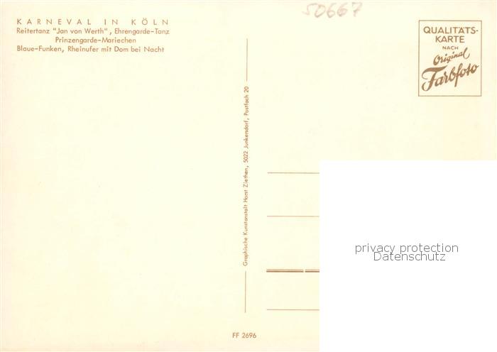 73865194 Koeln Rhein Rheinischer Karneval Reitertanz Jan von Werth Ehrengarde Prinzengarde Mariechen Blaue Funken Rheinufer mit Dom postalisch nicht gelaufen Erhaltung siehe scans [WerneD78] KatCode: 11110005315000