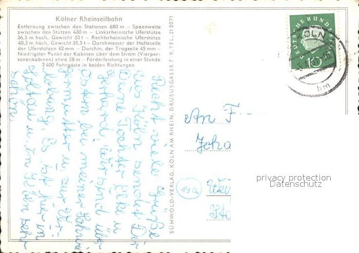 72331884 alte Postkarte Koeln Rhein Rheinseilbahn postalisch gelaufen Erhaltung siehe scans KatCode: 11110005315000