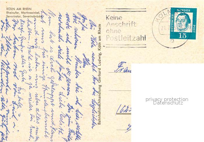 72851932 alte Postkarte Koeln Rhein Rheinufer Dom Dampfer Martinswinkel Severinstor Severinsbruecke postalisch gelaufen Erhaltung siehe scans [FriedD77] KatCode: 11110005315000