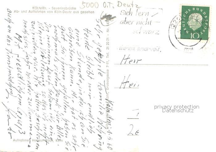 73690853 alte Postkarte Koeln Rhein Severinsbruecke Ab und Auffahrten von Deutz aus gesehen postalisch gelaufen Erhaltung siehe scans [WerneD78] KatCode: 11110005315000