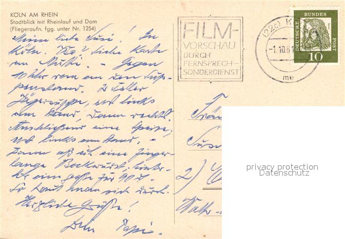 73170594 alte Postkarte Koeln Rhein Stadtblick mit Rheinlauf und Dom Fliegeraufnahme postalisch gelaufen Erhaltung siehe scans [FriedD77] KatCode: 11110005315000