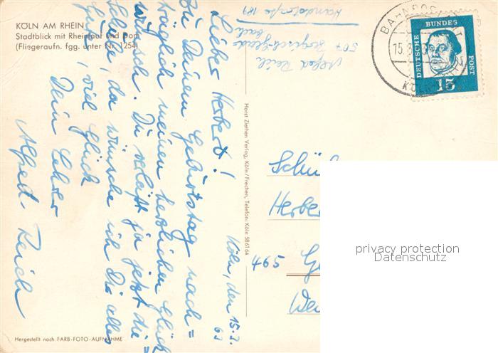73715214 alte Postkarte Koeln Rhein Stadtblick mit Rheinlauf und Dom postalisch gelaufen Fliegeraufnahme Erhaltung siehe scans [FriedD77] KatCode: 11110005315000