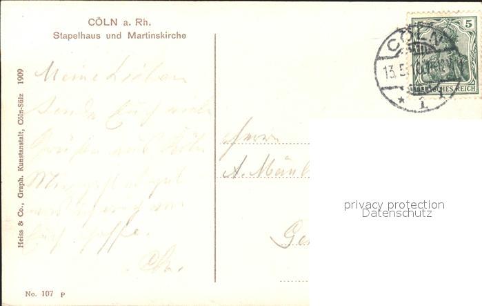71848296 alte Postkarte Koeln Rhein Stapelhaus Martinskirche postalisch gelaufen Erhaltung siehe scans KatCode: 11110005315000