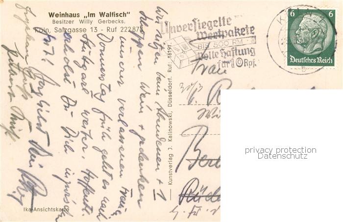 73801999 alte Postkarte Koeln Rhein Weinhaus Im Walfisch Gastraum postalisch gelaufen Erhaltung siehe scans [FriedD77] KatCode: 11110005315000