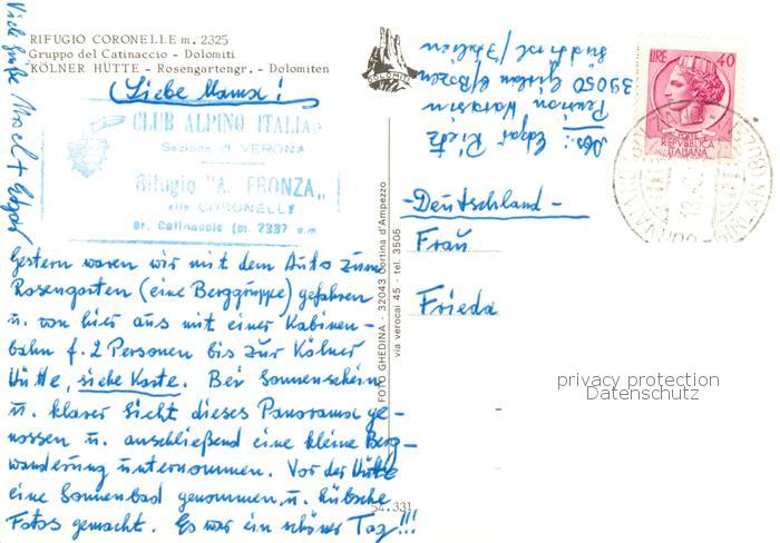 old postcard Koelnerhuette 2325m Rifugio Coronelle Dolomiti IT Berghuette Rosengartengruppe Dolomiten Gruppo del Catinaccio Fernsicht postalisch gelaufen Erhaltung siehe scans [FriedD77]