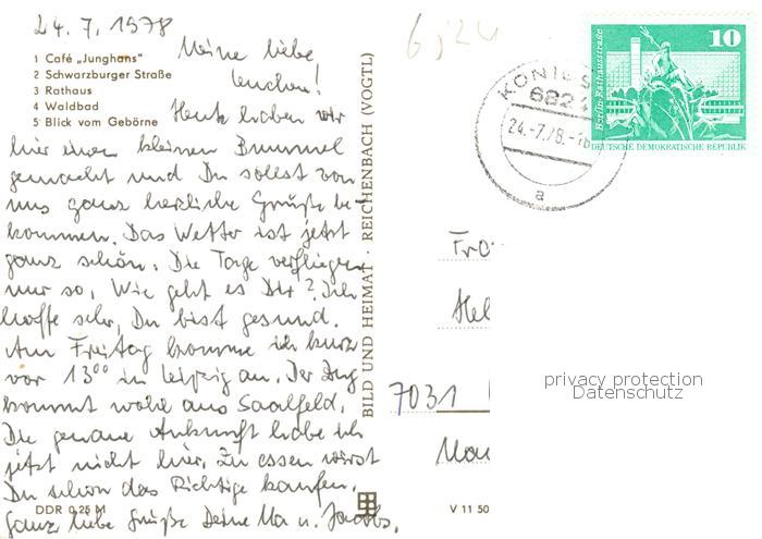 73865856 alte Postkarte Koenigsee Thueringen Cafe Junghans Schwarzburger Strasse Rathaus Waldbad Blick vom Geboerne postalisch gelaufen Erhaltung siehe scans [WerneD78] KatCode: 11110016073042