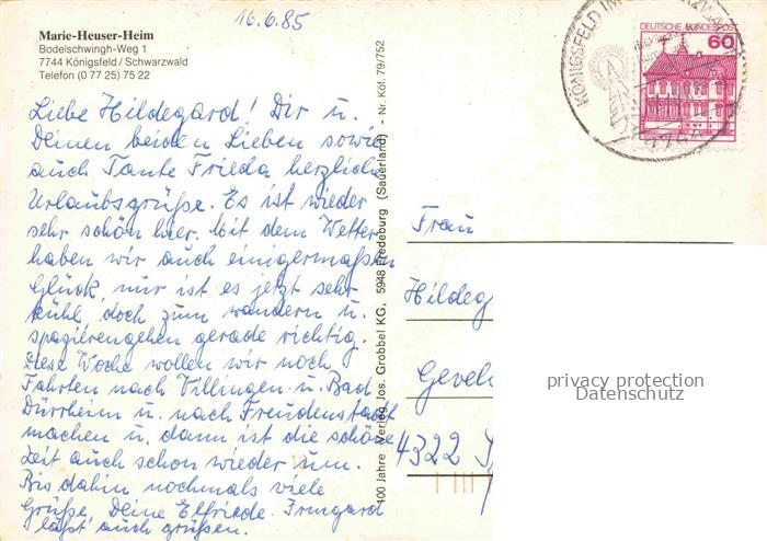 74156933 alte Postkarte Koenigsfeld Baden Schwarzwald BW Marie-Heuser-Heim Bodelschwingh-Weg Kurheim Garten Nadelwald VW-Kaefer Flachdachanbau postalisch gelaufen Erhaltung siehe scans [Karloger] KatCode: 11110008326031