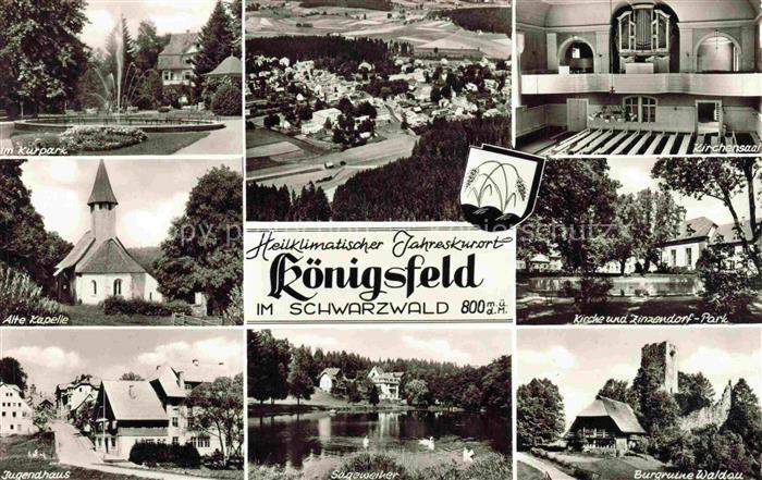 74087827 Koenigsfeld Baden Schwarzwald BW Panorama Kurpark Kapelle Jugendhaus Kirchensaal Zinzendorf-Park Burgruine Waldau Saegeweiher postalisch nicht gelaufen Erhaltung siehe scans [FriedD77] KatCode: 11110008326031